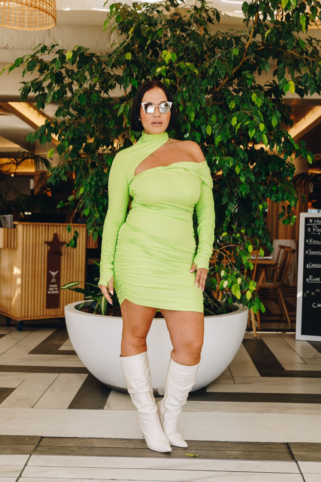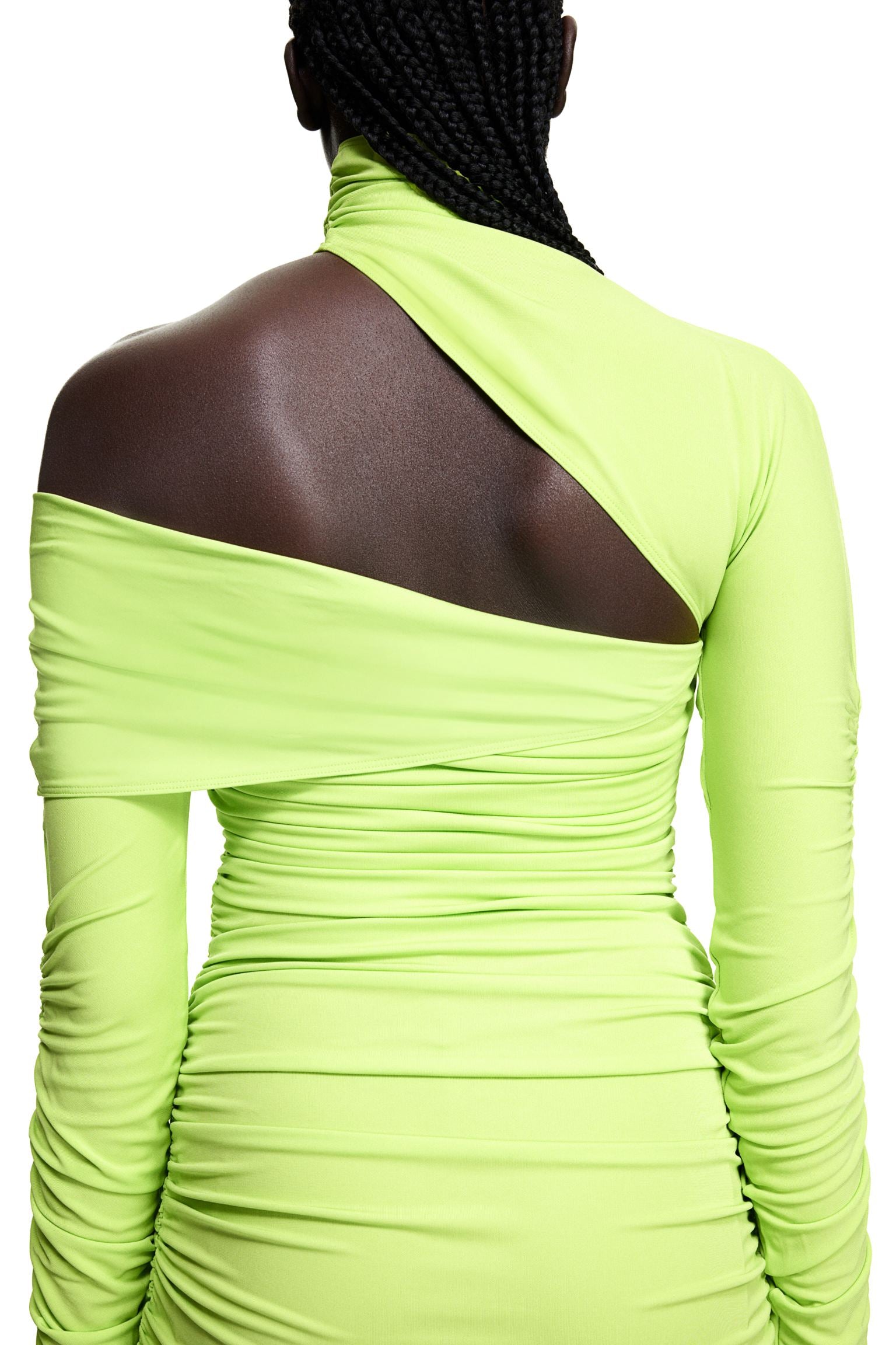 Unleash your inner diva with the Mugler H&M Figure-Hugging Mini Dress! This playful stunner is all about attitude. With its one-shoulder style, asymmetric cut, and angled foldover, it's a fashion-forward must-have. The high neck with a concealed fastener and star-shaped zip pull at the back add a touch of glamour. The extra-long sleeves and gathered side seams create an alluring draped effect. Get ready to make a bold statement in this jaw-dropping dress that's designed to turn heads!