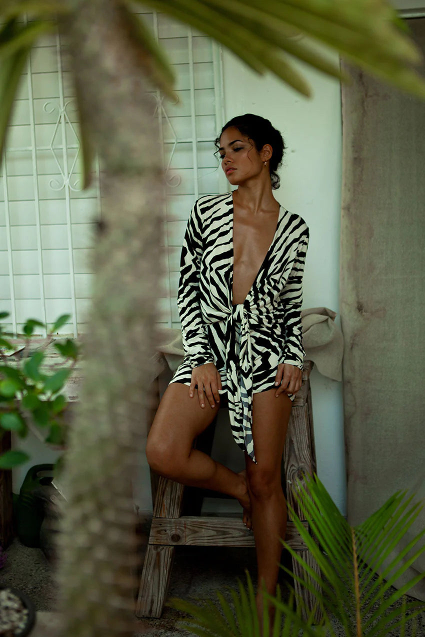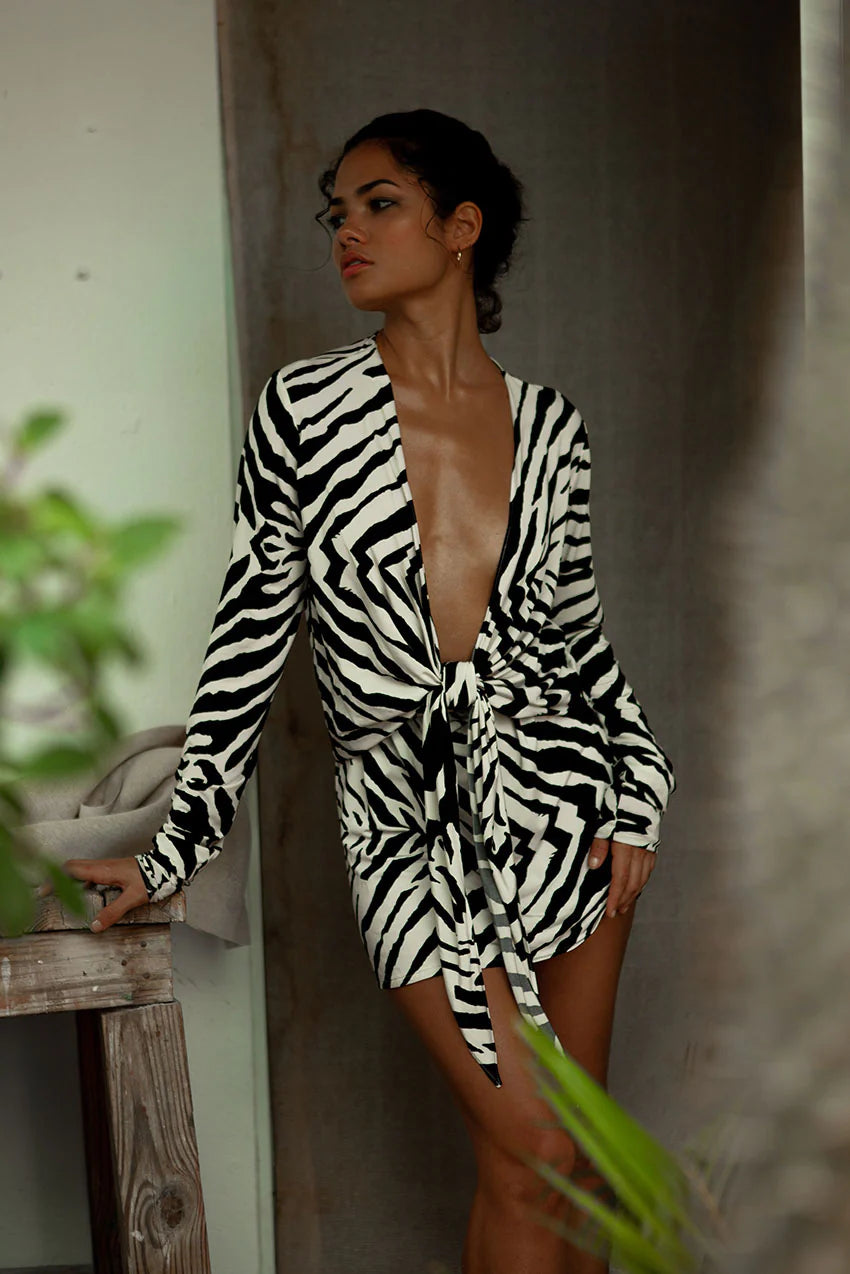 Turn heads in the Allegra—a wild, sassy dress that's as ready for adventure as you are. With a flattering waist tie and subtle zebra print, it's the perfect transition piece for your statement day to night wardrobe. Make this soft jersey style your favourite, and get ready for some serious fun!