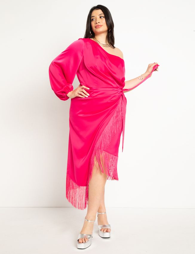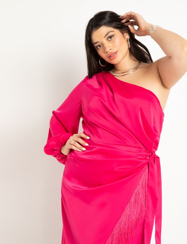 Get ready to own the dance floor with The Nasrin dress from Eloquii! This ultra-trendy plus-size stunner is the life of the party. With a fabulous one-shoulder cut, vibrant magenta hue, and flirty fringing on the bodice, it's all about making a statement. The puff sleeve with elastic cuff adds a touch of drama, while the above-the-knee length lets you show off your lovely legs. Get your groove on and be the center of attention in The Nasrin!