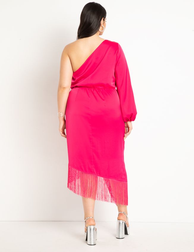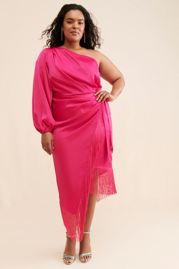 Put your best fringe forward in The Nasrin! From Eloquii, the ultra-trendy plus size dress has got all the goods to make your outfit the life of the party - one shoulder cut, magenta hue, and flirty fringing on bodice. Dress to impress with the puff sleeve and elastic cuff, and show off those lovely legs!