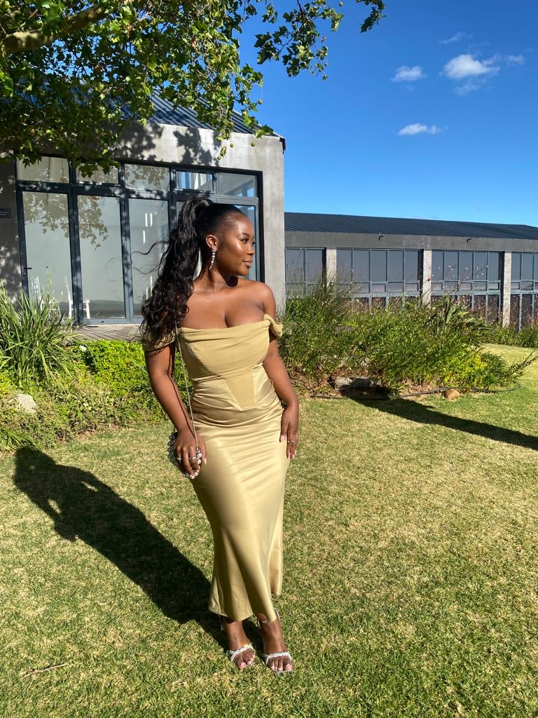 Natalya' has a sexy and elegant silhouette we know you'll love in a beautiful olive green hue. It has our extra special corsetry boning for the ultimate support and uplift. The sultry draped straps can be worn on or off the shoulders. We love the topstitching side panels, made from our lustrous single duchess satin.The draped skirt is ultra flattering and made from our double duchess satin that's delicately pleated, falling to a slightly flared midi hem. It has a zip to the back for easy and is fully lined for a smooth finish.