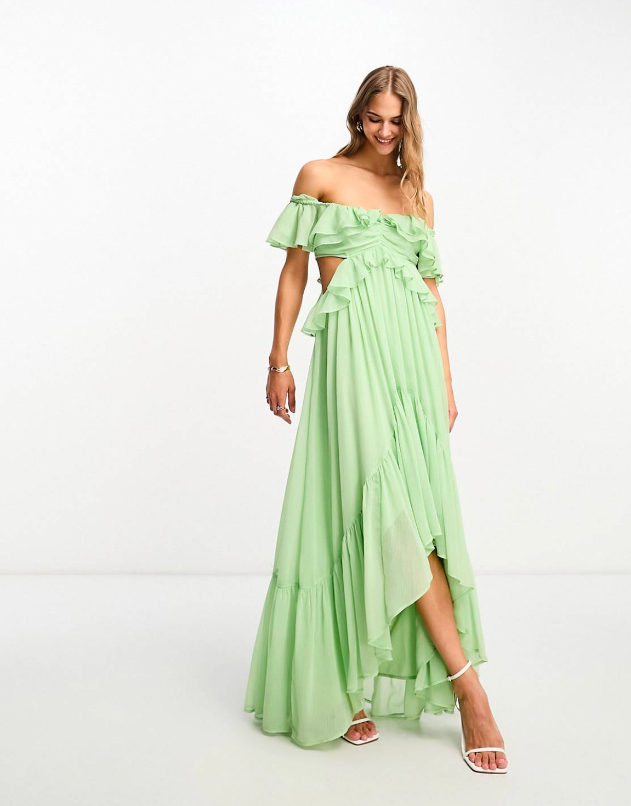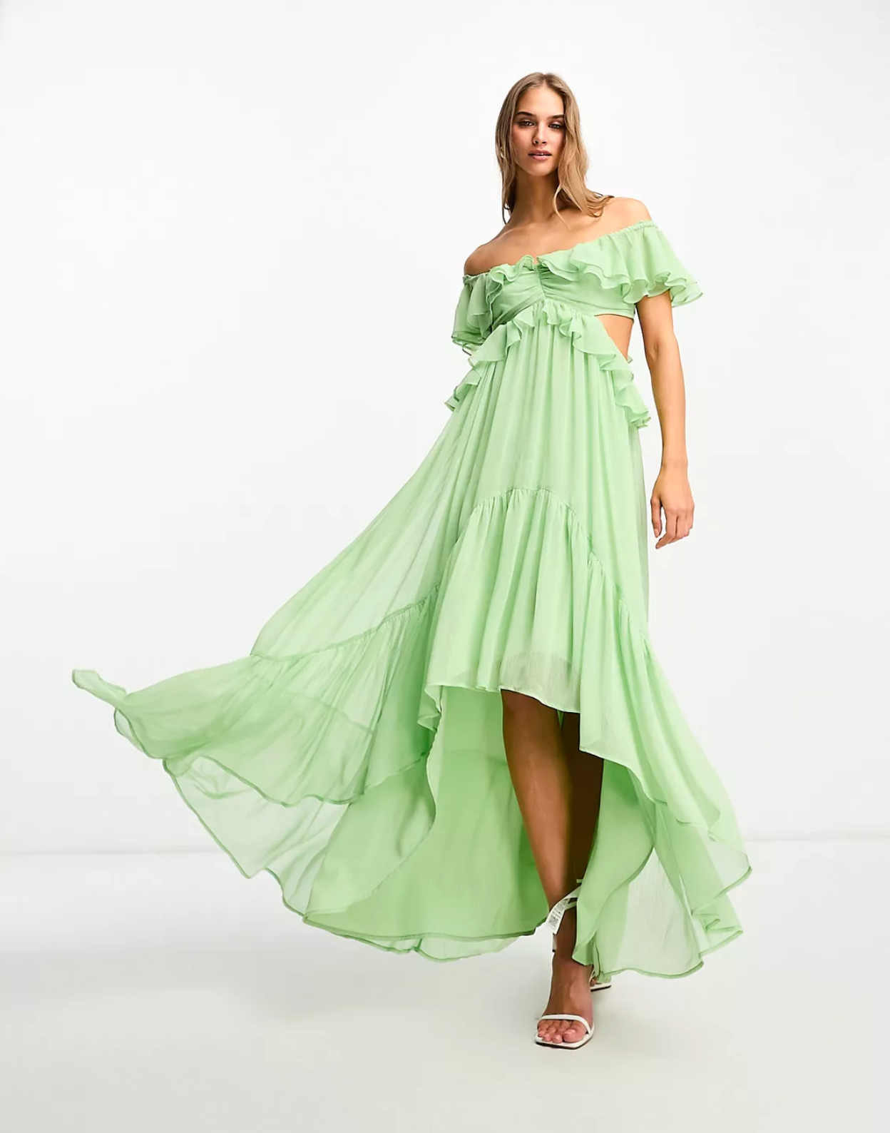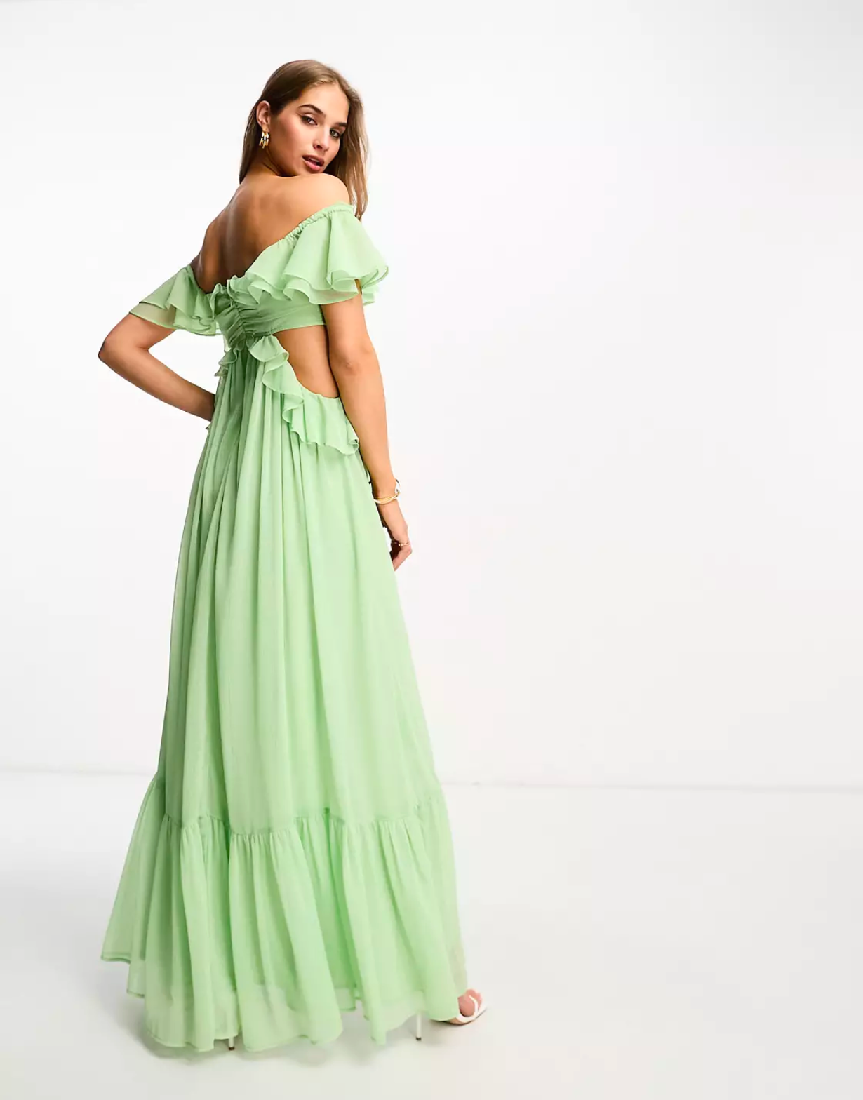 Meet the Sage Green Off-Shoulder Maxi Dress - the ultimate head-turner! With playful frill sleeves and a cut-out waist, it's all about those eye-catching details. The hi-low hem and ruffle cut-outs add a touch of flair, making it the perfect outfit for any occasion. Get ready to embrace your style in this stunning dress that's as enchanting as a fairytale!